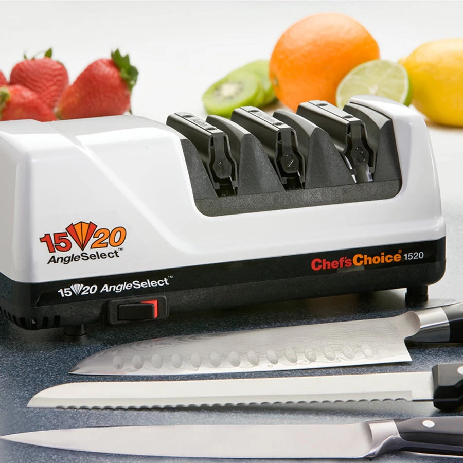 The Chef’sChoice AngleSelect Model 1520 Electric Knife Sharpener restores your steel knife blades to factory-sharp condition. To put a razor-sharp edge on any household knife blade, simply run it through this 3-stage sharpener, which creates an edge that is much stronger and longer lasting than hollow ground, or v-shaped edges. This sharpener provides ultimate versatility, with options for both 15 and 20 degree edges.