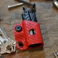 This Clip & Carry Kydex Sheath is designed to fit the Leatherman Squirt or the Gerber Dime. It is proudly constructed in the USA from a durable kydex material, and can be adjusted to your preferences.