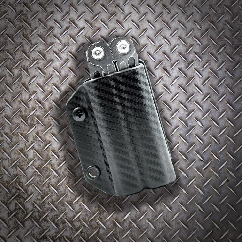 This Clip & Carry Kydex Sheath is designed to fit the Leatherman Wingman, Sidekick, Rebar or Rev. It is proudly constructed in the USA from a durable kydex material, and can be adjusted to your preferences.
