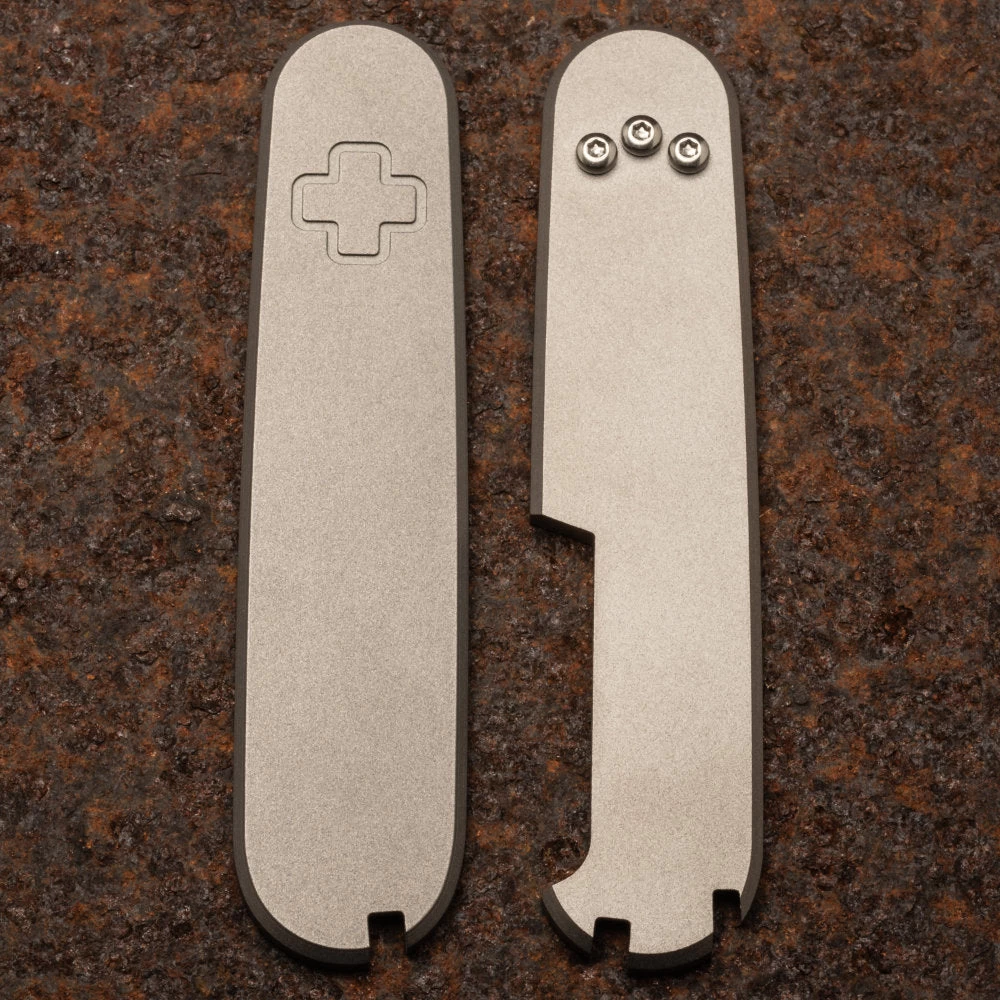 Daily Customs 91.2+ Plain Titanium Handles provide a stunning upgrade for any Victorinox 91.2 mm (3.5-inch) Swiss Army Knife, turning it into a beautiful collector’s item. These rugged handles are both elegant and practical, providing a unique customization for your everyday-carry.