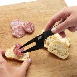 The Colori+ 3-Piece Cheese Knife Set by Kuhn Rikon is the perfect cheese board companion, with a mini cleaver for hard cheeses, a cheese fork with a serrated edge perfect for baguette and salami, and a soft cheese knife. The soft cheese knife has a forked tip, and comes with a blade sheath to keep the knife and your fingers safe.