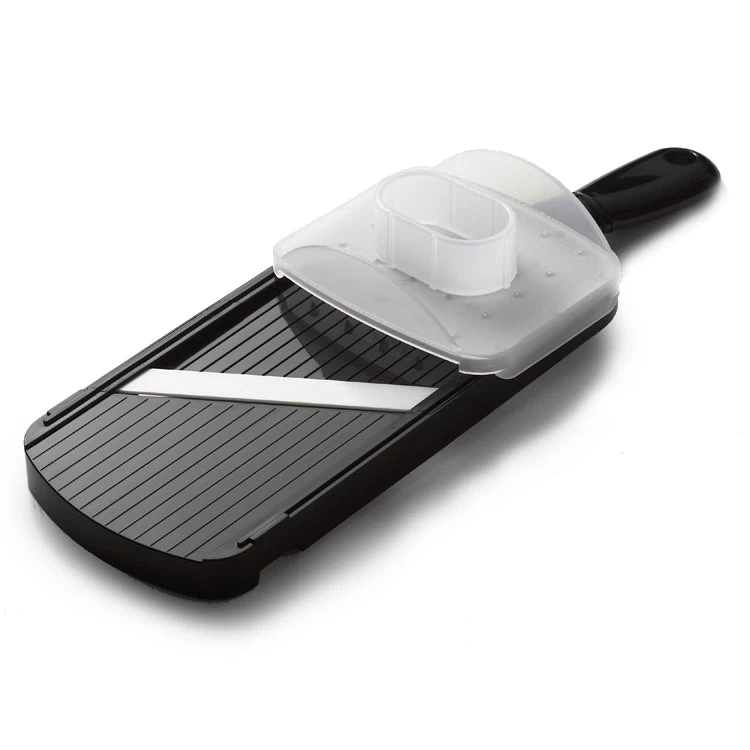 This mandoline quickly, easily and uniformly slices vegetables such as cabbage, carrots, cucumbers, onions, potatoes and more for uniform cooking and beautiful presentation. Foods glide smoothly across the sharp, angled blade. The notch at the bottom of the mandoline hook over the edges of most bowls for stability, and the ergonomic handle is comfortable to hold.