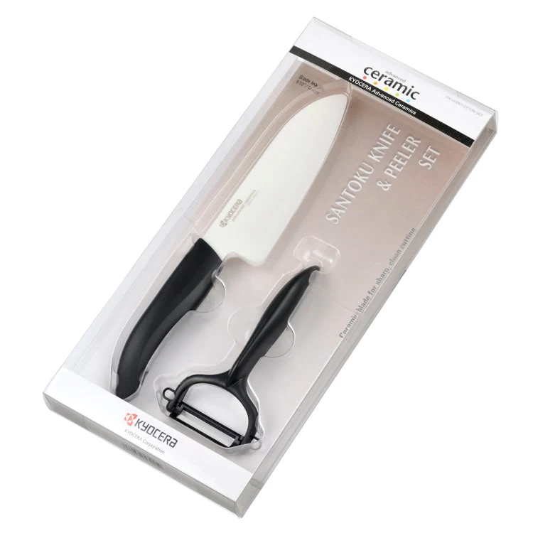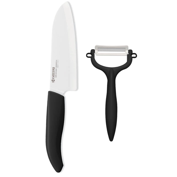 This set by Kyocera features a Revolution Series 5.5″ Ceramic Santoku Knife and a matching Horizontal Ceramic Y Peeler.