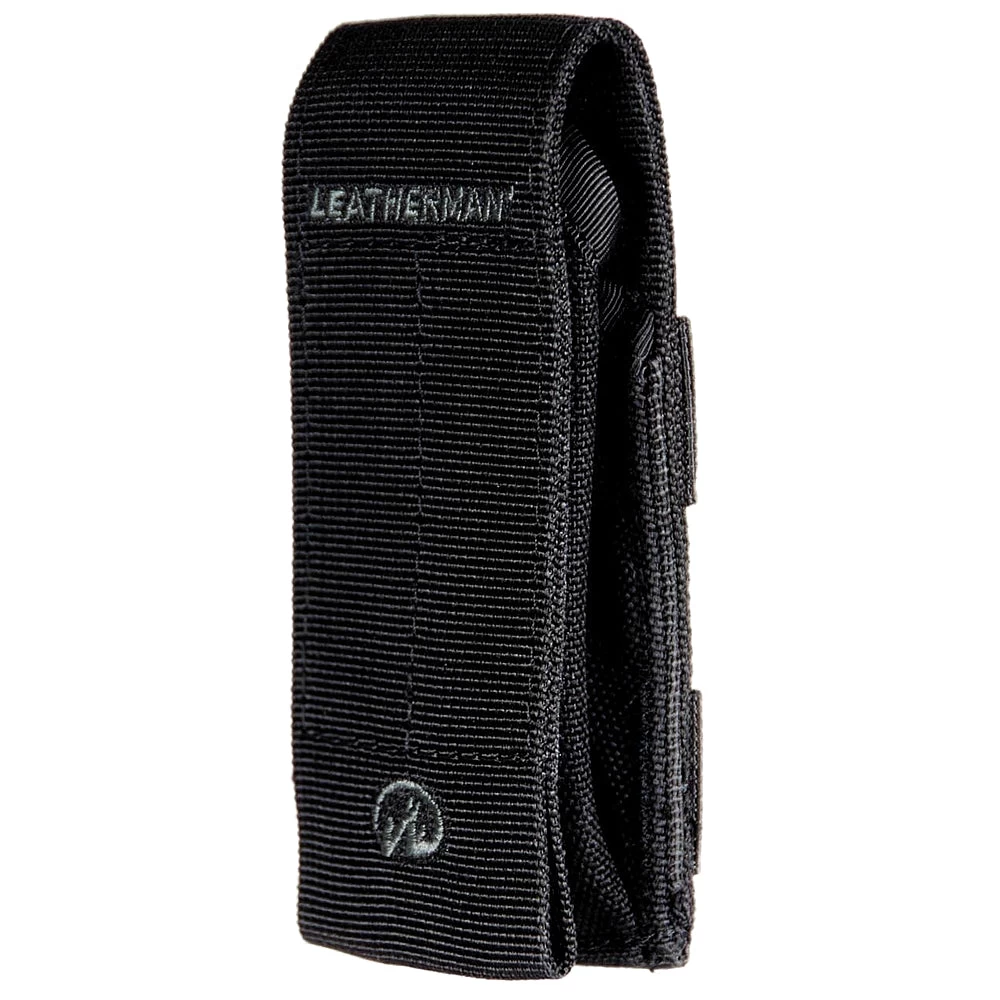 This black, nylon Leatherman XL MOLLE (Military) Sheath features snap webbing strap for attachment on backside. Attachement webbing can hold MUT accessory wrench. The sheath has Leatherman logo and Velcro front closure and internal panel storage to hold extra bits.