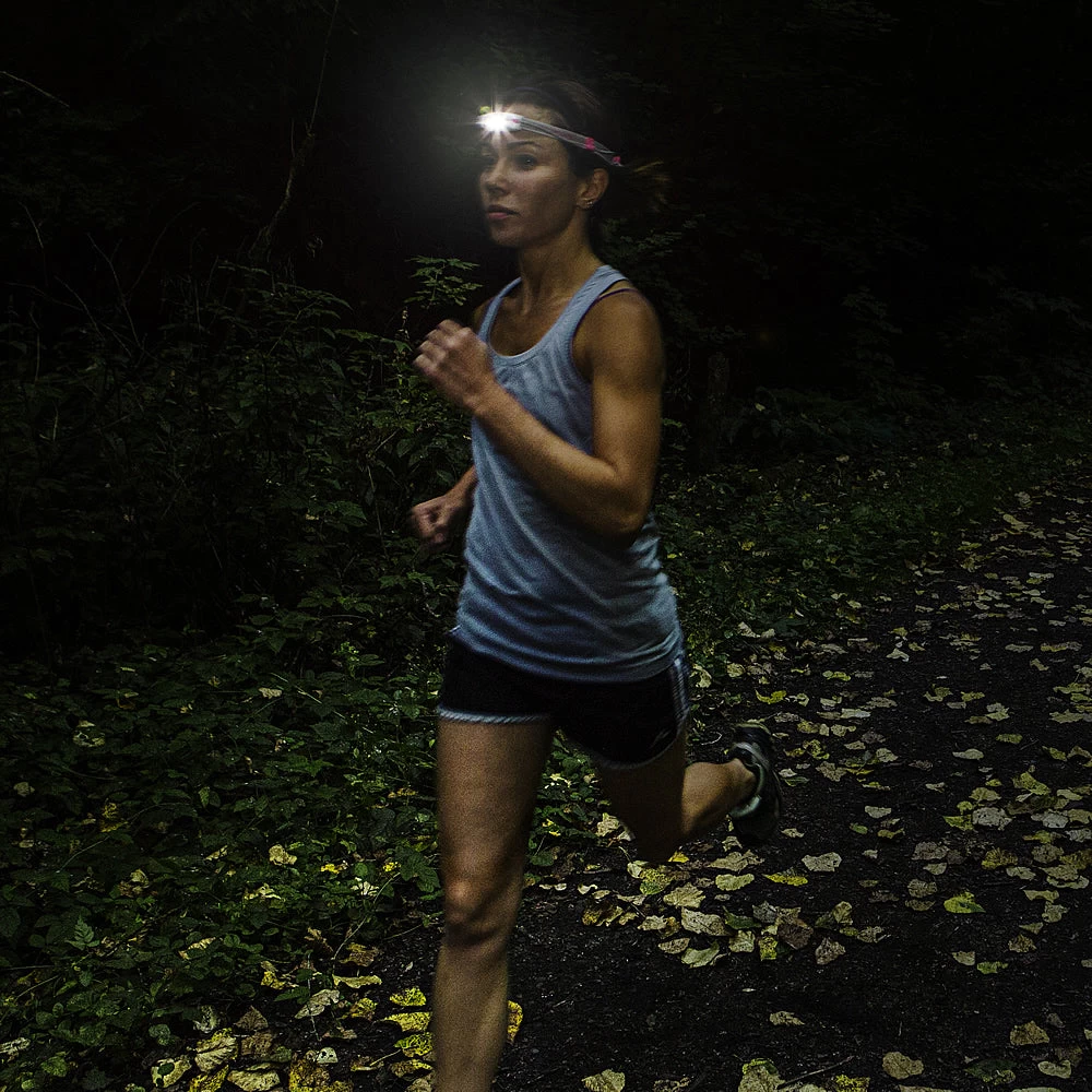 The NEO Headlamp is especially well suited to running and walking after dark, providing a dramatic, wide lighting area that illuminates everything in your path – both directly in front of you and off to the side. A unique, innovative wide beam reflector illuminates a 190 degree horizontal area and a 150 degree vertical area, allowing you to see and be seen from any angle. A blinking red light integrated into the slim rear battery compartment further improves road safety by improving your visibility to passing cars.