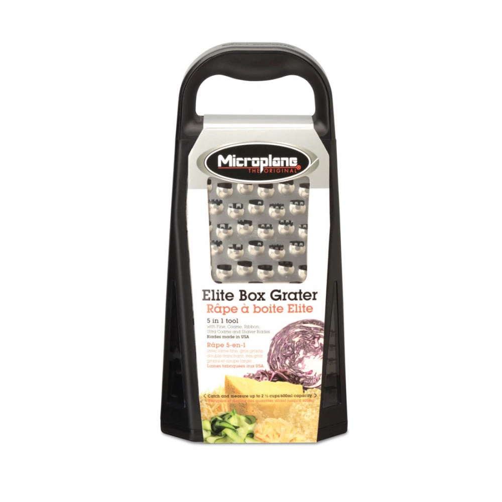 The Microplane Elite Box Grater features five blade styles for all of your grating needs. A sliding plate at the bottom catches the grated food, and a clear window with measurements makes it easy to measure your progress and grate exactly as much as you need for your recipe.
