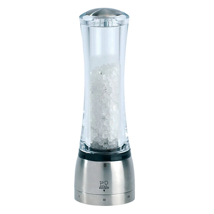 The Daman 8.25″ u’Select Salt Mill by Peugeot is made in France from sparkling acrylic and sleek stainless steel. The Daman does not have a center shaft, making it easy to refill, higher in capacity, and visually appealing. The Daman’s reservoir stopper is magnetized, and the grinding mechanism is concave, flush with the bottom of the mill. The acrylic in this modern mill is highly polished to resist scratching and cloudiness over time.