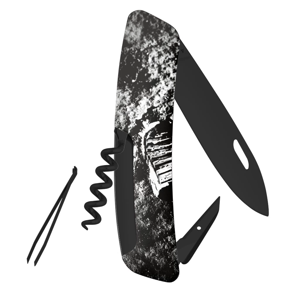 The Swiza D01 Moonwalk 50 All Black Swiss Pocket Knife is an authentic Swiss Knife with a bold design celebrating the 50th anniversary of man’s first steps on the moon, which took place on July 21, 1969 when astronaut Neil Armstrong set foot on the lunar surface, followed by Buzz Aldrin shortly thereafter. An astronaut takes a step on the moon on the front of this collectible knife, and an iconic moon footstep is printed on the back. This striking design is set off well with all-black blades and implements. These black metal tools are coated with a ceramic material, PVD titanium nitride, making them hard and corrosion-resistant.