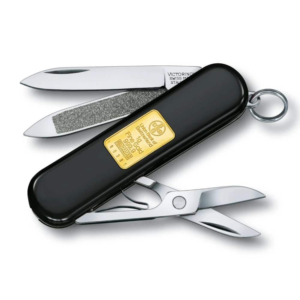 The Gold Ingot Classic Swiss Army Knife by Victorinox is a stunning collector’s item. This beautiful piece is inlaid with a genuine one-gram gold ingot issued by the Union Bank of Switzerland.