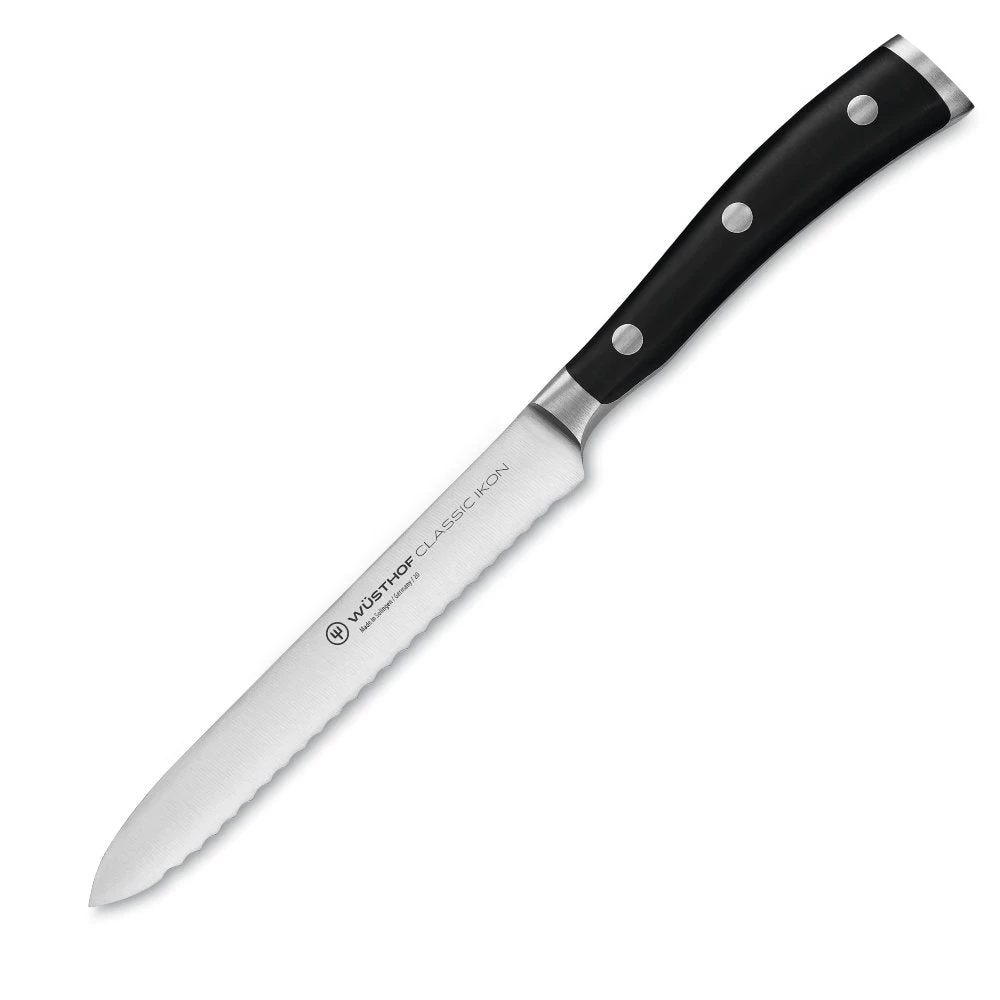 The Classic Ikon 5″ Serrated Utility Knife by Wusthof is well suited for any kitchen need. It is the best choice for easily slicing rolls and bagels. The serrated edge also makes this knife a clear favorite for cutting a variety of foods from hard salami to even the ripest tomato.