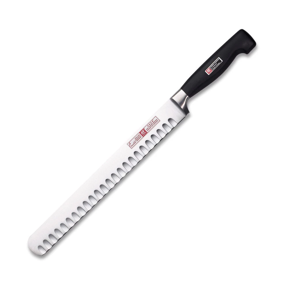 The Zwilling TWIN Four Star 10″ Hollow Edge Slicing Knife is the knife you need should you require finely sliced meats and fish – or even just to cut the cake! The long, flexible blade with alternating hollows on each side of the cutting edge and rounded tip will make quick work of slicing that ham shank into fine portions.
