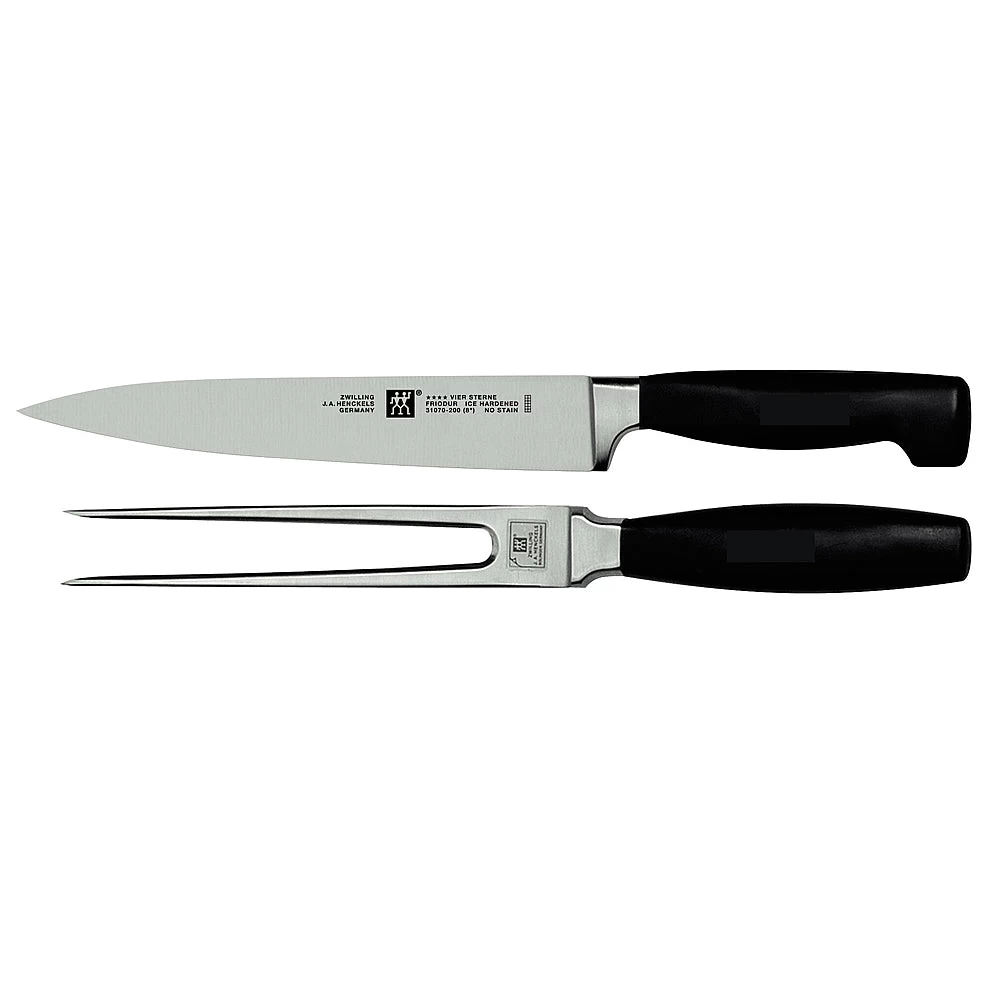 The Zwilling TWIN Four Star 2-Piece Carving Set includes an 8″ Carving Knife and a 7″ Carving Fork.