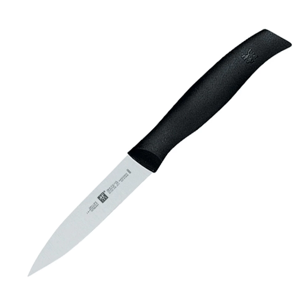 The Zwilling TWIN Grip 3.5″ Paring Knife by J.A. Henckels is ideal for cleaning, paring, peeling and slicing small fruits and vegetables, and creating garnishes. It is a very efficient extension of your thumb and finger, and thus provides very good leverage, allowing for very intricate work. Its ergonomic, textured handle makes sure your grip remains firm even in wet conditions.